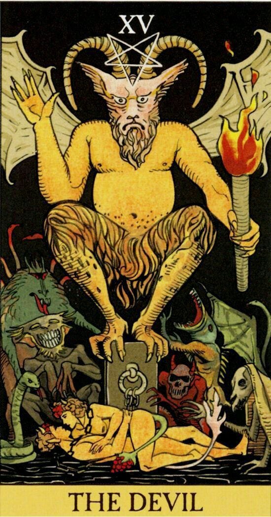 “Shadow work” is a phrase with increasing buzz in recent history, and whether it is due to an increase in pop psychology or a genuine shift in human consciousness is inconsequential to me. All that matters to me is that people are getting comfortable with their darkness, with the Devil and all he represents. Can you sit with emotions or experiences that are unpleasant? Negative? Scary? What about all-out devastating? Can you honor and take lessons from feelings like jealousy, rage, insecurity, and loss? Too often we want to turn away from unsavory parts of our human existence, but these parts are structural: we could not be ourselves without them. Denying their power or their gravity does not mean they are any less vital to the whole of what you are. The full range of the human experience is there for us to have in whole, not in parts, and the Devil represents these parts of our experiences we would rather reject or forget. He wants you to embrace yourself with his guidance, because only through embracing your shadow can you truly see the value of your light. Shadow work is a journey into one’s self, perhaps in the pursuit of god — that is, the unending force of love that permeates our universe.